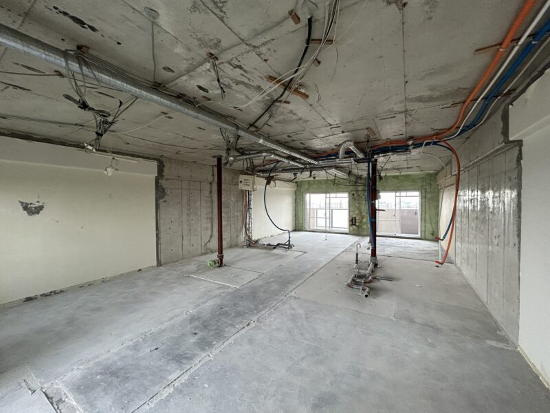 →躯体の梁や柱、パイプスペースなど圧迫感を感じられるものをプランニング・照明計画を⽤いて⾯積以上に広く感じられる空間を演出します。
