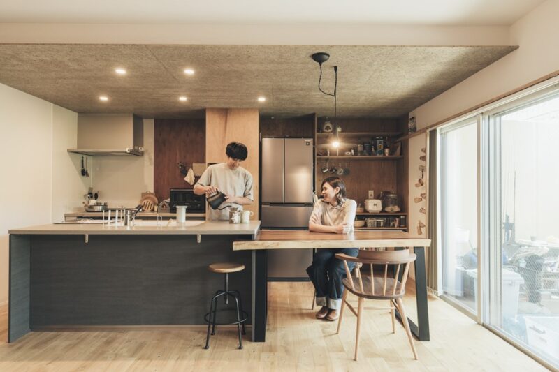 →木のマンションリノベは、無垢のフローリングや紙クロス、コルクの床材、一枚板のダイニングテーブルなど自然素材をふんだんに使用。家に帰ると ”ホッと”する安らぎを与えてくれます。
